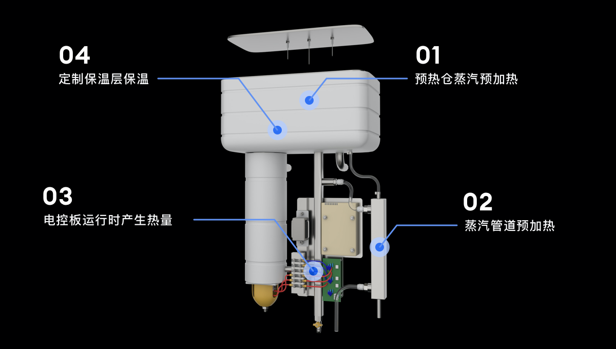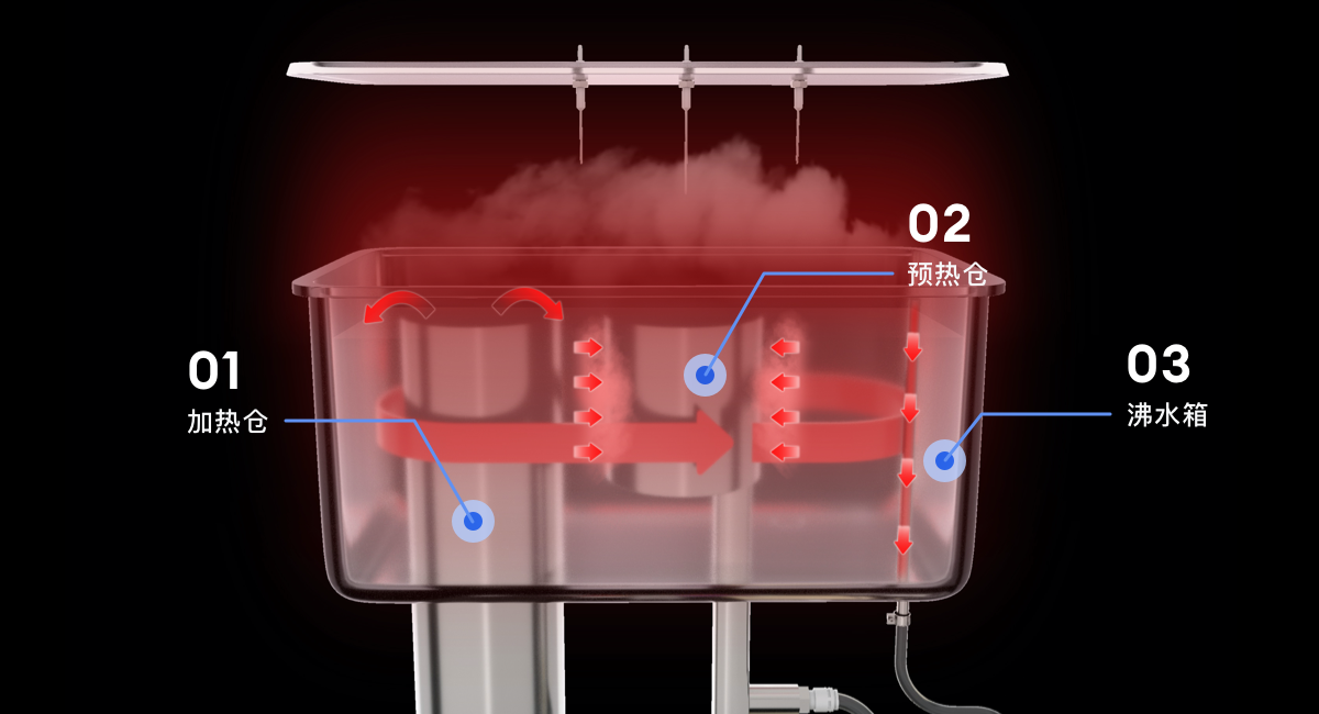 能够利用沸水产生的蒸汽热量,通过连接管传导来预热冷水(纯净水)保温箱为密封状态,更有效保温热水。