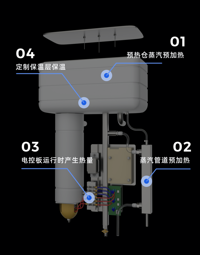 预热仓在沸水箱内,外部为沸水产生的蒸汽,进一步提前预热。