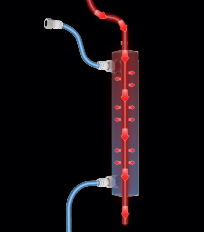 蒸汽管道为中空结构,冷水通过下进水口进入管道,被蒸汽产生的热量通过金属管进行预加热。