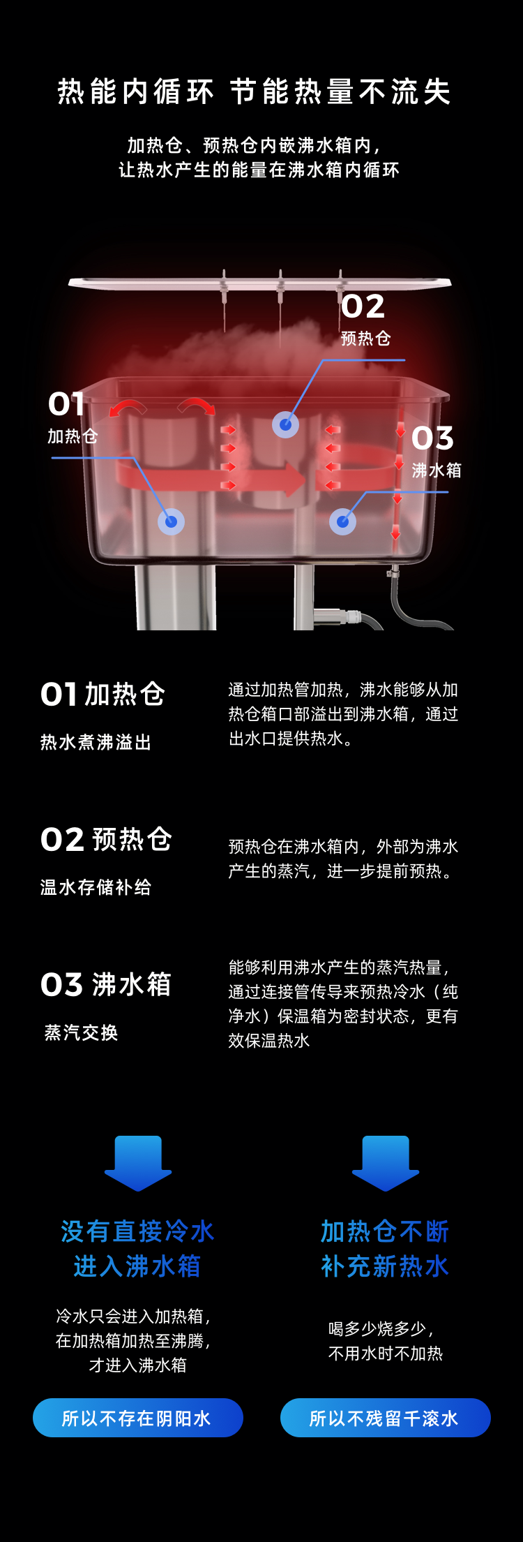 加热仓、预热仓内嵌沸水箱内,让热水产生的能量在沸水箱内循环