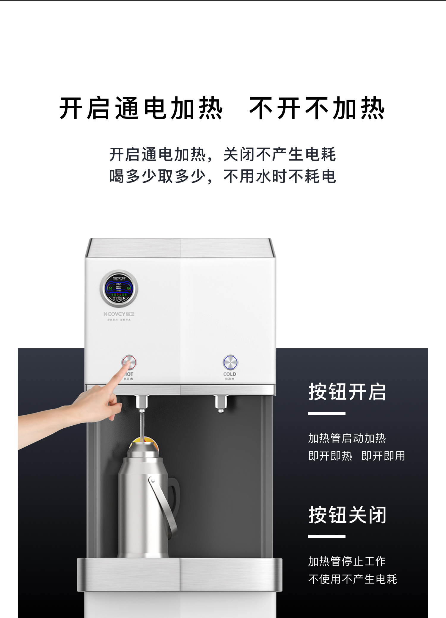 开启通电加热,关闭不产生电耗 喝多少取多少,不用水时不耗电